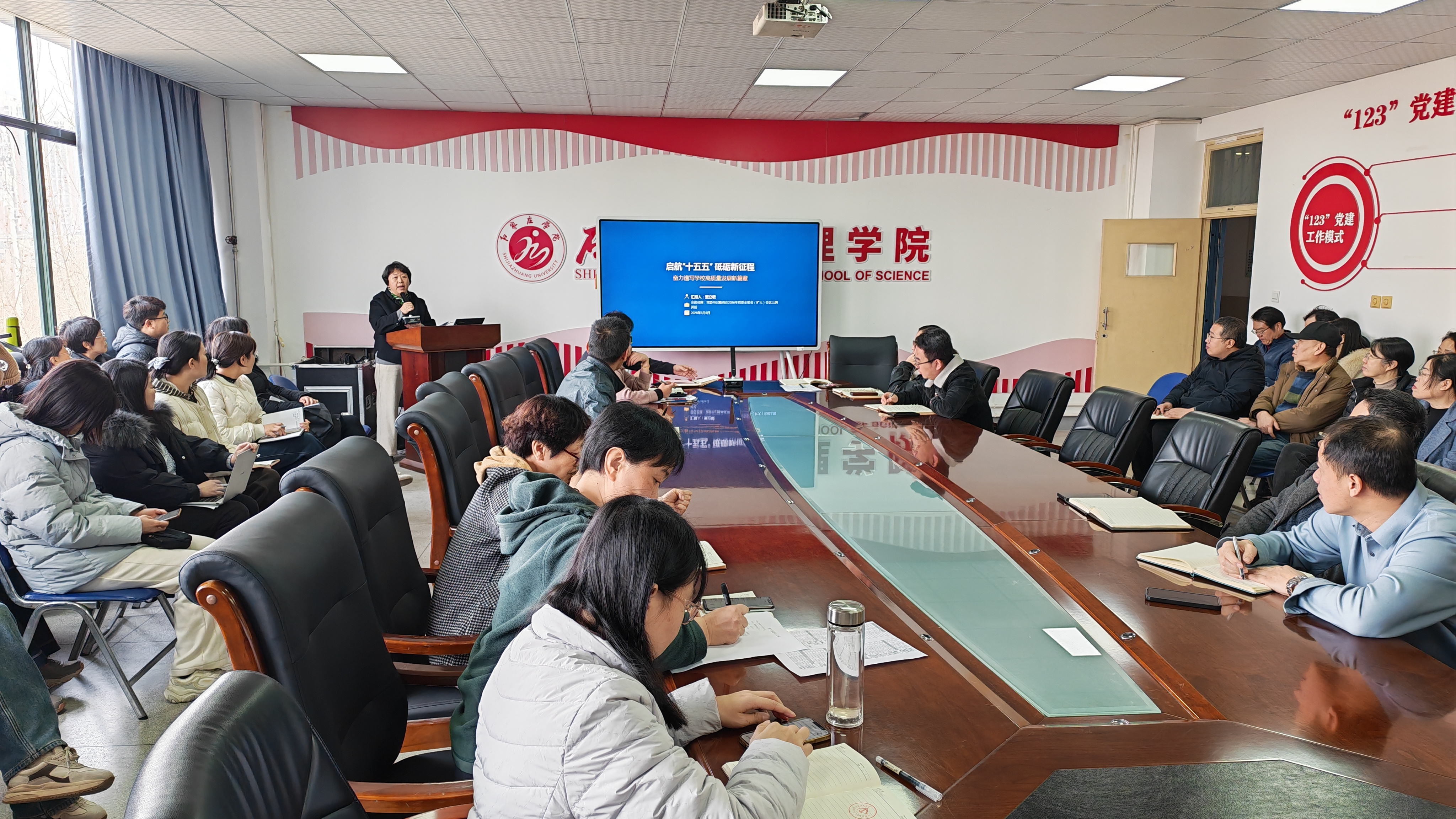 会上,党总支书记贾立敏传达了党委全委会(扩大)会议精神,系统解读了学校 “十四五”时期取得的八个方面发展成就、“十五五”开局之年的七项工作部署以及“干、专、廉、安”的四项要求。她提出三点要求:一要思想统一,坚决摒弃“等靠要”。在学校申硕攻坚关键期,每位教师要把个人发展与学校、学院目标绑在一起,用实干代替观望。二要团结协作,凝聚合力。打破教研室壁垒,跨学科协作,老中青互助,形成1+1>2的合力,不搞内耗,共同维护学院团结氛围。三要务实担当,奉献作为。每位教师要把教学、科研、服务地方工作做细做实,遇到问题不推诿,主动认领任务,以担当和奉献推动学院发展。